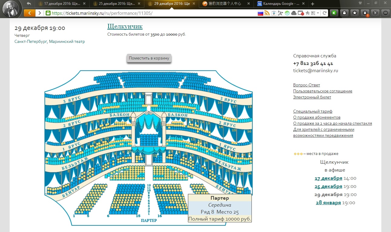 8 Ряд партера - 10 000 рупий. Очень хорошо. Это ведь того стоит. Это самый лучший детский новогодний спектакль. А в исполнении учащихся Агриппининской Академии (Русского Балета) самый лучший "Щелкунчик". Здесь всё самое-самое (кроме декораций, они устарели 35 лет назад).